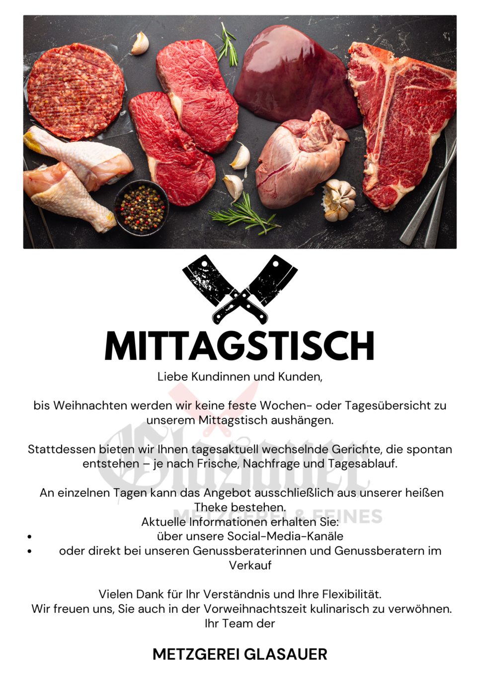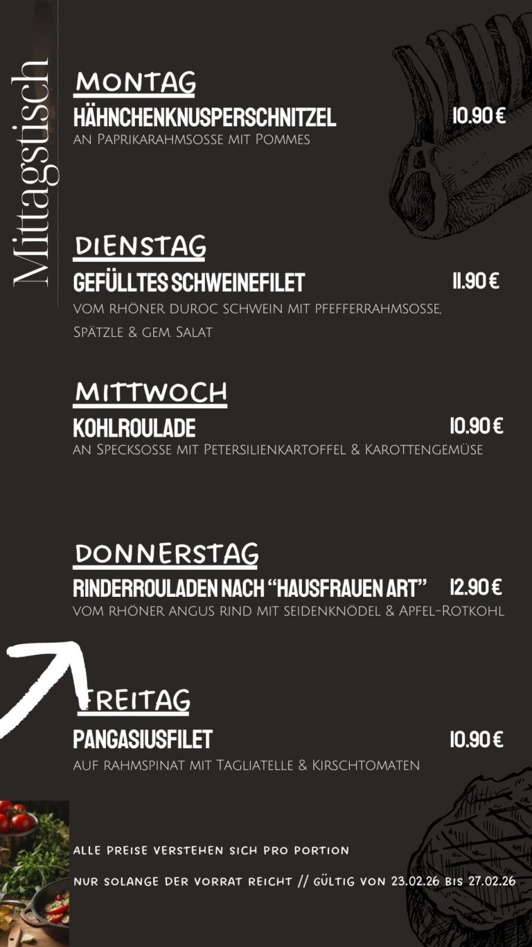 Jede Woche neu überraschen wir Sie mit unserem wechselnden Mittagstisch und attraktiven Wochenangeboten. Ob herzhafte Klassiker, feine Spezialitäten oder schnelle Genussmomente – bei uns kommt garantiert keine Langeweile auf.